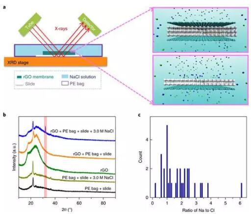 圖1 a)實(shí)驗(yàn)裝置的示意圖。B)浸入3.0 MNaCl溶液中的rGO膜的XRD圖像與四個控制系統(tǒng)的XRD圖案 C)通過EDS-TEM測定的2D晶體結(jié)構(gòu)中Na與Cl的比率。