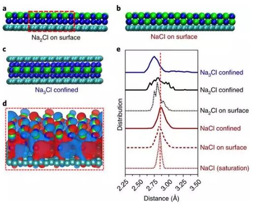 圖2:DFT計算Na+和Cl-的結(jié)構(gòu)(在石墨烯表面上和兩個石墨烯片之間)a-c)Na2Cl(a)和NaCl(b)晶體分別與石墨烯片上的Na和Cl元素以2:1和1:1的比率與Na3Cl(c)d)在Na2的區(qū)域(紅色虛線)內(nèi)捕獲的分子軌道的最高占用狀態(tài)Cl晶片(a)。e)不同系統(tǒng)中粒子的徑向分布函數(shù)。每個峰顯示每個晶體結(jié)構(gòu)的最近鄰Na-Cl距離分布。